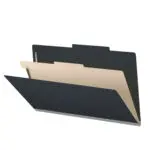 Black Legal Size Top Tab One Divider Classification Folder with 2″ Gray Tyvek Expansion and 2″ Bonded Fasteners on Inside Front and Back and 1″ Duo Fastener on Divider, 25 pt Type 3 Pressboard Stock Covers and 18 pt Manila Divider, Packaged 10/50