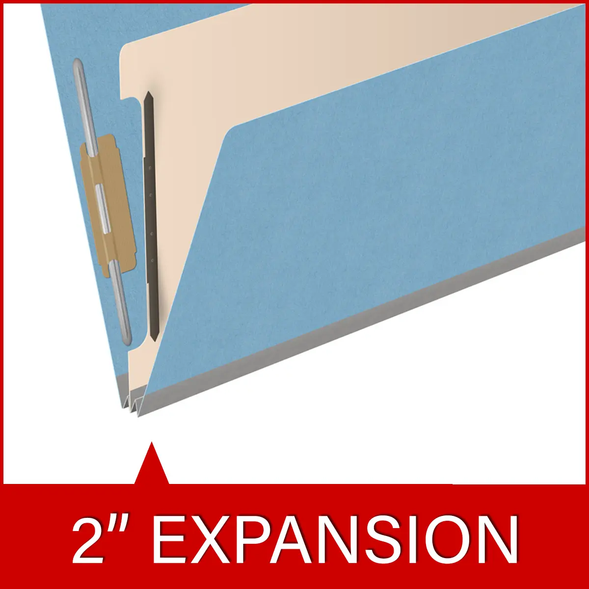 Blue legal size end tab classification folder with 2″ gray tyvek expansion, with 2″ bonded fasteners on inside front and inside back and 1″ duo fastener on divider, 18 pt paper stock and 18 pt manila divider, Packaged 10/50