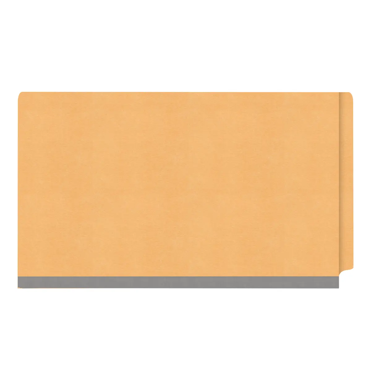 Gold legal size end tab classification folder with 2" gray tyvek expansion, with 2" bonded fasteners on inside front and inside back and 1" duo fastener on dividers, 18 pt paper stock and 18 pt manila dividers, Packaged 10/50