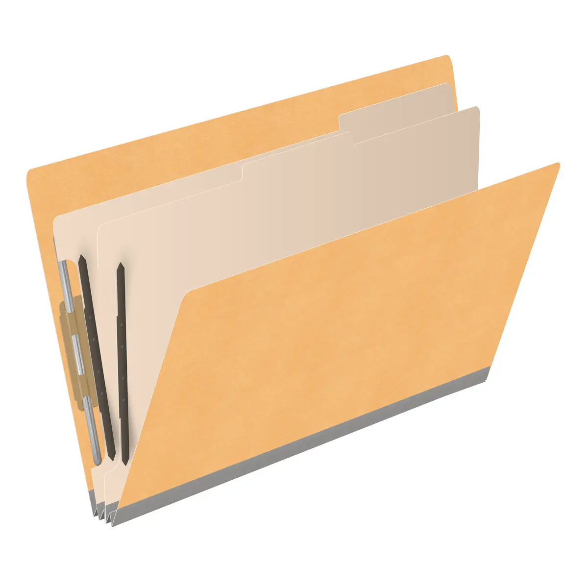 Gold legal size end tab classification folder with 2″ gray tyvek expansion, with 2″ bonded fasteners on inside front and inside back and 1″ duo fastener on dividers, 18 pt paper stock and 18 pt manila dividers, Packaged 10/50