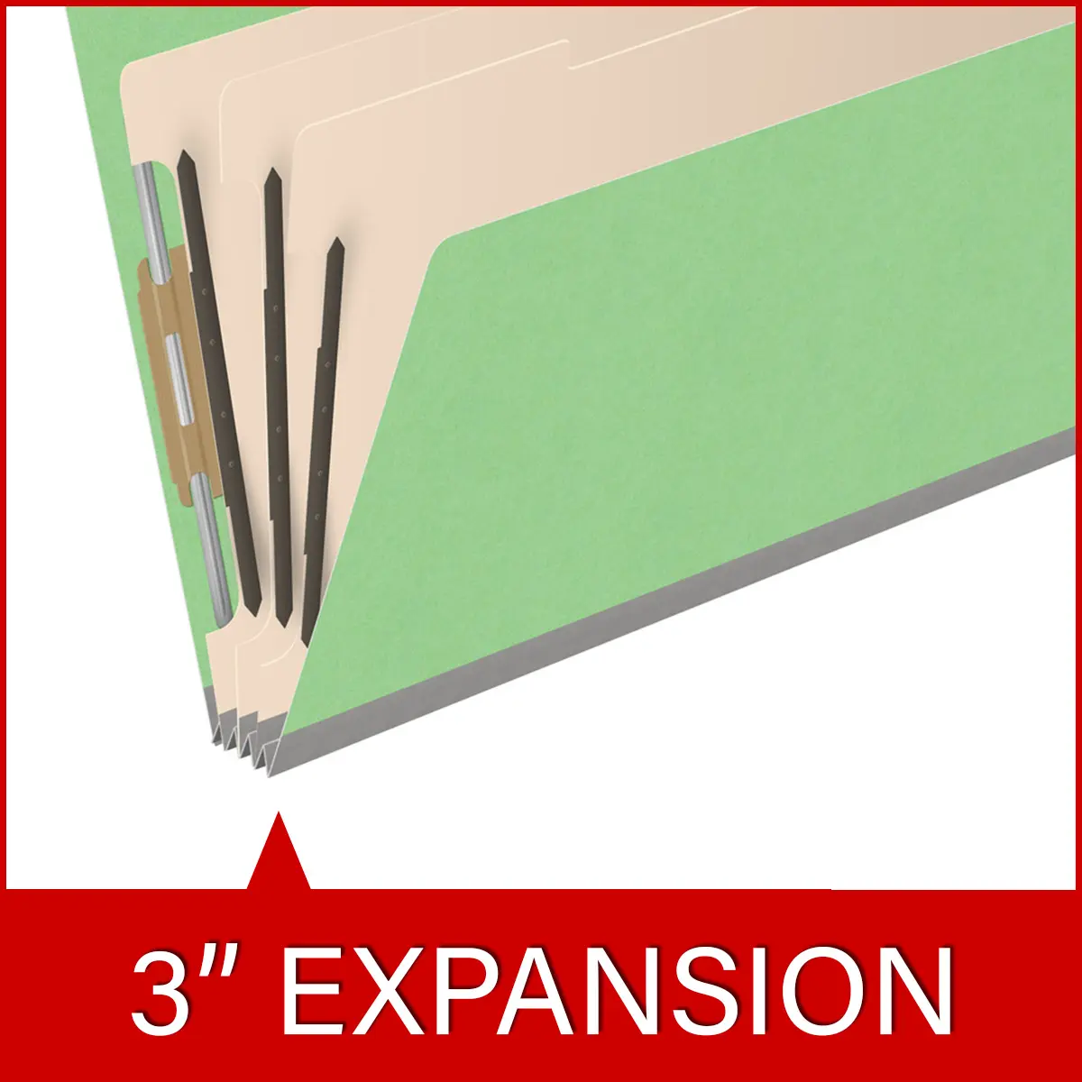 Green legal size end tab classification folder with 3″ gray tyvek expansion, with 2″ bonded fasteners on inside front and inside back and 1″ duo fastener on dividers, 18 pt paper stock and 18 pt manila dividers, Packaged 10/50