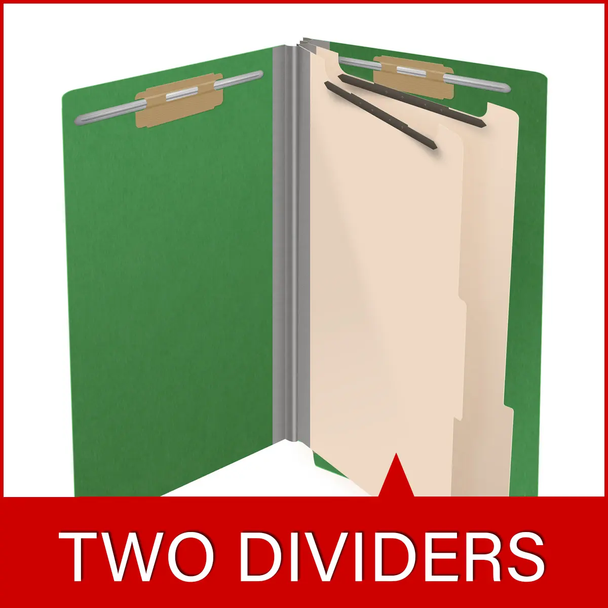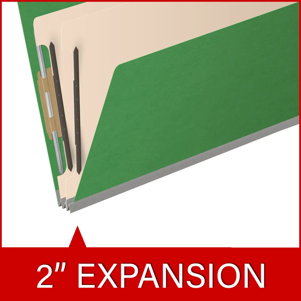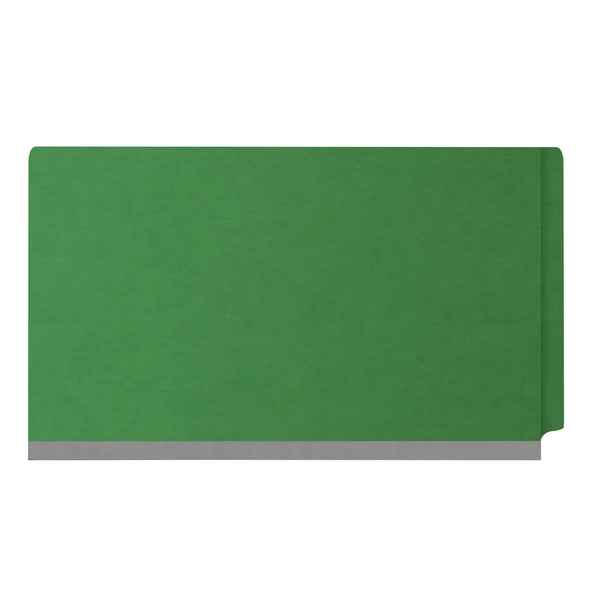 Green Legal Size End Tab Two Divider Classification Folder with 2″ Pearl Green Tyvek Expansion and 2″ Bonded Fasteners on Inside Front and Inside Back and 1″ Duo Fastener on Dividers, 25 pt Type 2 Pressboard Stock Covers and 18 pt Manila Dividers, Packaged 10/50