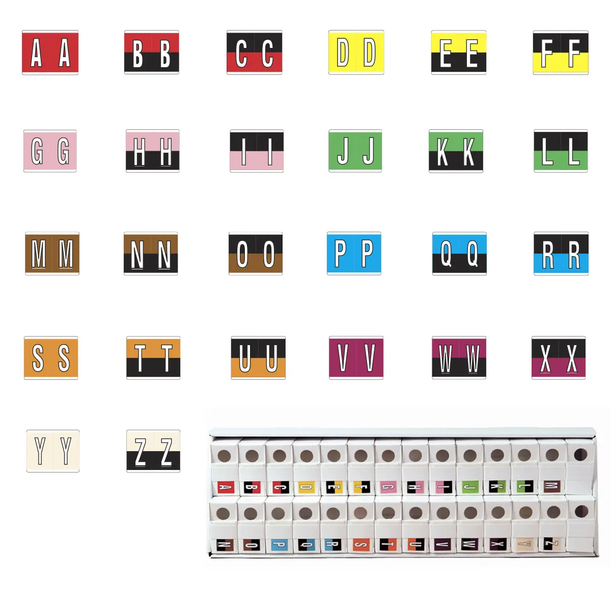 Multiple Color Kardex PSF-139 Compatible Alpha Labels of size 1-1/4" x 1-1/2" with Individual Letter "A-Z", Laminated Stock Packaged in 26 Rolls of 500
