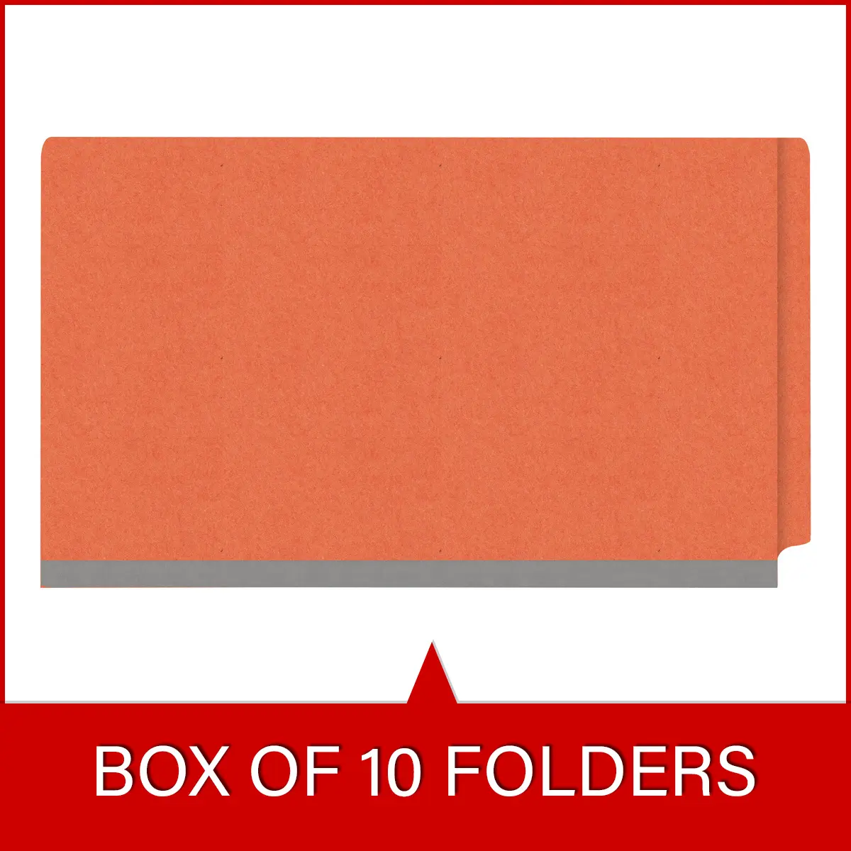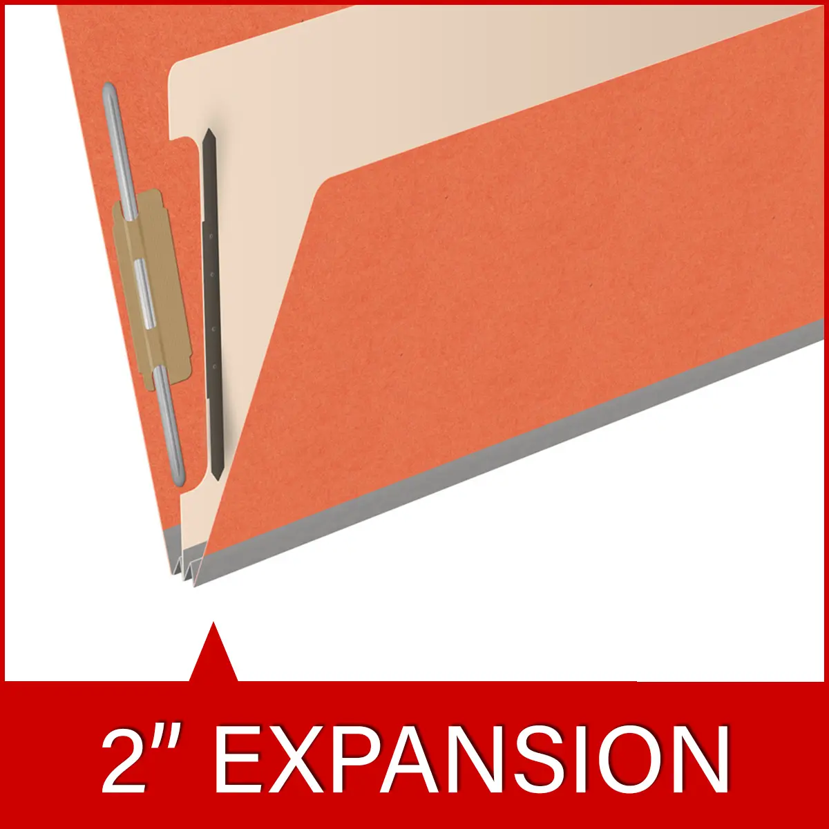 Orange legal size end tab classification folder with 2" gray tyvek expansion, with 2" bonded fasteners on inside front and inside back and 1" duo fastener on divider, 18 pt paper stock and 18 pt manila divider, Packaged 10/50