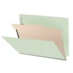 Pale green letter size end tab one divider classification folder with 2″ gray tyvek expansion, with 2″ bonded fasteners on inside front and inside back and 1″ duo fastener on divider, 25 pt type 3 pressboard stock covers and 18 pt manila divider, Packaged 10/50