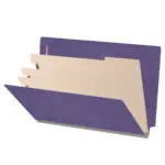Purple legal size end tab two divider classification folder with 2″ gray tyvek expansion, with 2″ bonded fasteners on inside front and inside back and 1″ duo fastener on dividers, 25 pt type 3 pressboard stock covers and 18 pt manila dividers, Packaged 10/50