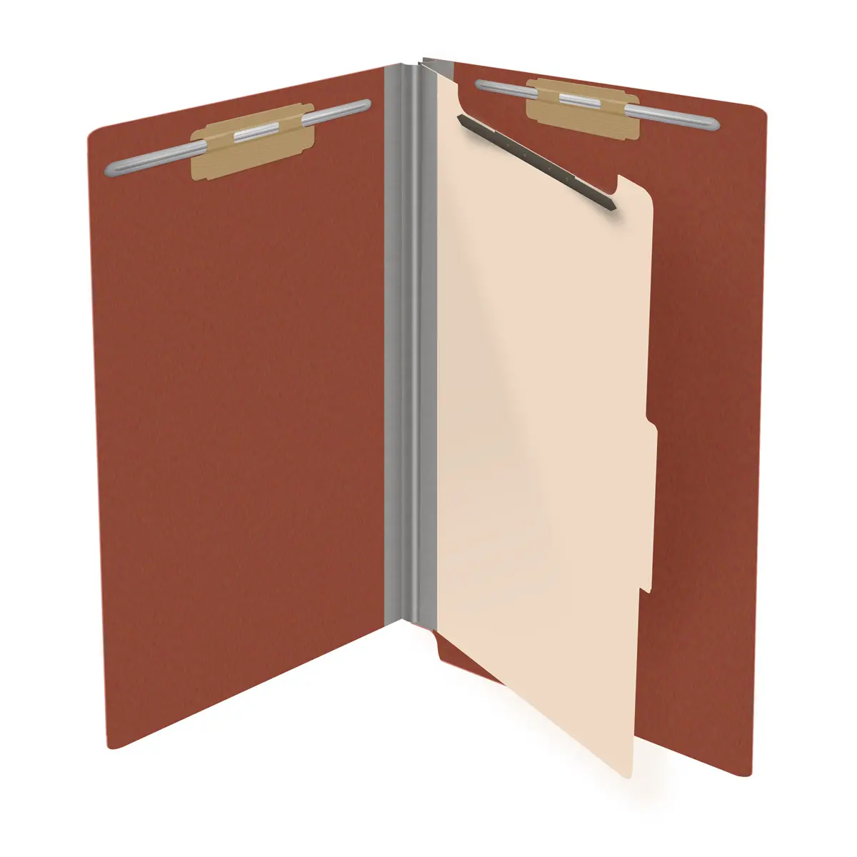 Red Legal Size End Tab One Divider Classification Folder with 2″ Russet Brown Tyvek Expansion and 2″ Bonded Fasteners on Inside Front and Back and 1″ Duo Fastener on Divider, 25 pt Type 3 Pressboard Stock Covers and 18 pt Manila Divider, Packaged 10/50