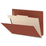 Red Letter Size End Tab One Divider Classification Folder with 2″ Russet Brown Tyvek Expansion and 2″ Bonded Fasteners on Inside Front and Back and 1″ Duo Fastener on Divider, 25 pt Type 3 Pressboard Stock Covers and 18 pt Manila Divider, Packaged 10/50
